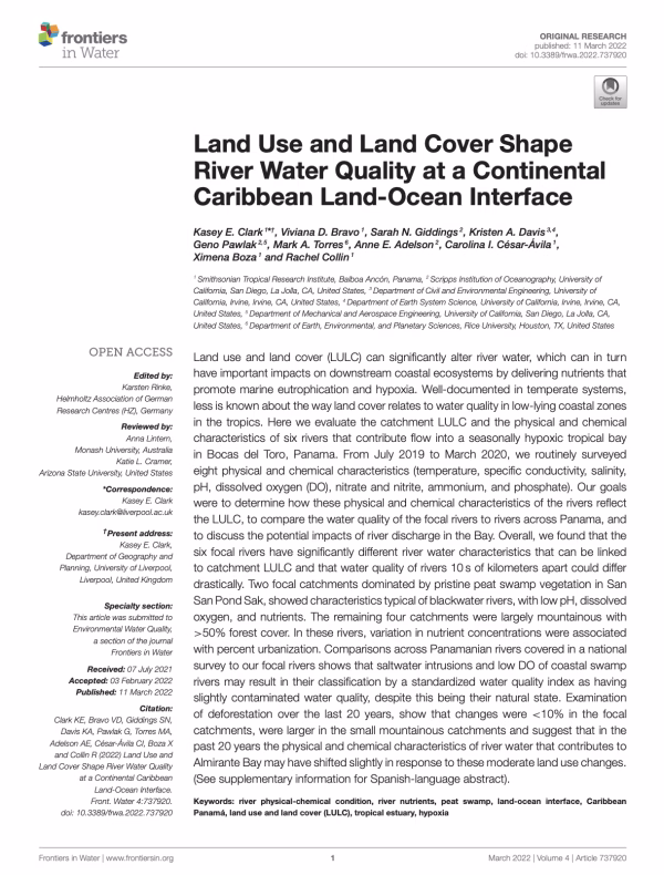 Land use and land cover (LULC) can significantly alter river water, which can in turn have important impacts on downstream coastal ecosystems by delivering nutrients that promote marine eutrophication and hypoxia. Well-documented in temperate systems, less is known about the way land cover relates to water quality in low-lying coastal zones in the tropics. Here we evaluate the catchment LULC and the physical and chemical characteristics of six rivers that contribute flow into a seasonally hypoxic tropical bay in Bocas del Toro, Panama. From July 2019 to March 2020, we routinely surveyed eight physical and chemical characteristics (temperature, specific conductivity, salinity, pH, dissolved oxygen (DO), nitrate and nitrite, ammonium, and phosphate). Our goals were to determine how these physical and chemical characteristics of the rivers reflect the LULC, to compare the water quality of the focal rivers to rivers across Panama, and to discuss the potential impacts of river discharge in the Bay. Overall, we found that the six focal rivers have significantly different river water characteristics that can be linked to catchment LULC and that water quality of rivers 10 s of kilometers apart could differ drastically. Two focal catchments dominated by pristine peat swamp vegetation in San San Pond Sak, showed characteristics typical of blackwater rivers, with low pH, dissolved oxygen, and nutrients. The remaining four catchments were largely mountainous with >50% forest cover. In these rivers, variation in nutrient concentrations were associated with percent urbanization. Comparisons across Panamanian rivers covered in a national survey to our focal rivers shows that saltwater intrusions and low DO of coastal swamp rivers may result in their classification by a standardized water quality index as having slightly contaminated water quality, despite this being their natural state. Examination of deforestation over the last 20 years, show that changes were <10% in the focal catchments, were larger in the small mountainous catchments and suggest that in the past 20 years the physical and chemical characteristics of river water that contributes to Almirante Bay may have shifted slightly in response to these moderate land use changes. (See supplementary information for Spanish-language abstract).